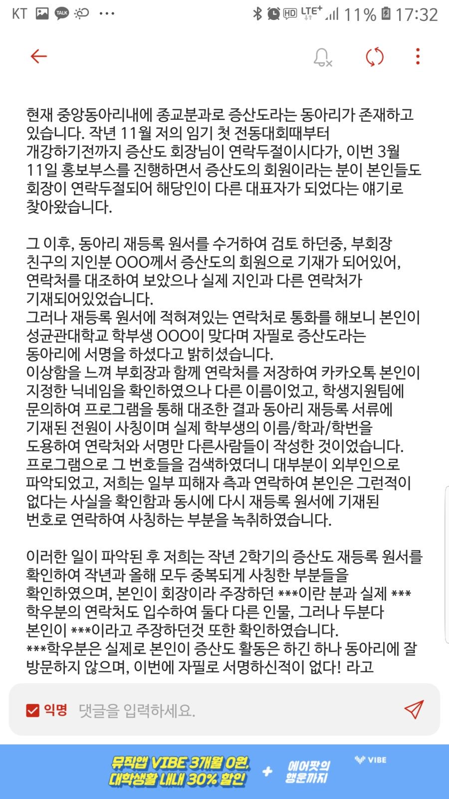 성균관대 중앙동아리 사건 터짐 외부인들이 조작 서류로 학교에 들어와서 전도활동함 htt